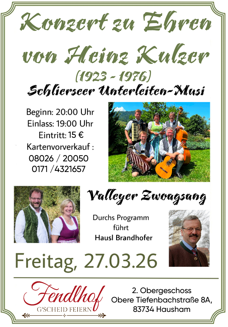Nicht nur unter Volksmusikanten ist Heinz Kulzer ein Begriff, auch als Arrangeur und Swing-Musiker ist er eine Legende. Ihm zu Ehren hat die Schlierseer Unterleiten-Musi am 27.03.2026 ein buntes Programm, ausschließlich mit Kompositionen von Heinz Kulzer zusammengestellt. Auch der Valleyer Zwoagsang wird Lieder aus der Feder von Heinz Kuzler singen. Durchs Programm führt Hausl Brandhofer, der einiges Wissenswertes über diesen Ausnahmemusiker zu erzählen weiß.