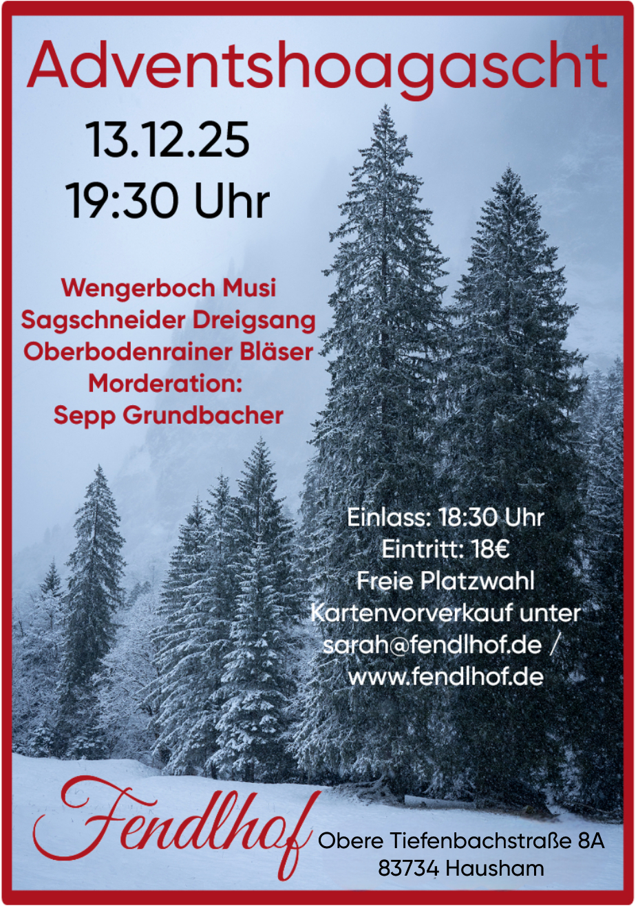Kartenvorverkauf ab sofort unter: sarah@fendlhof.de / www.fendlhof.de