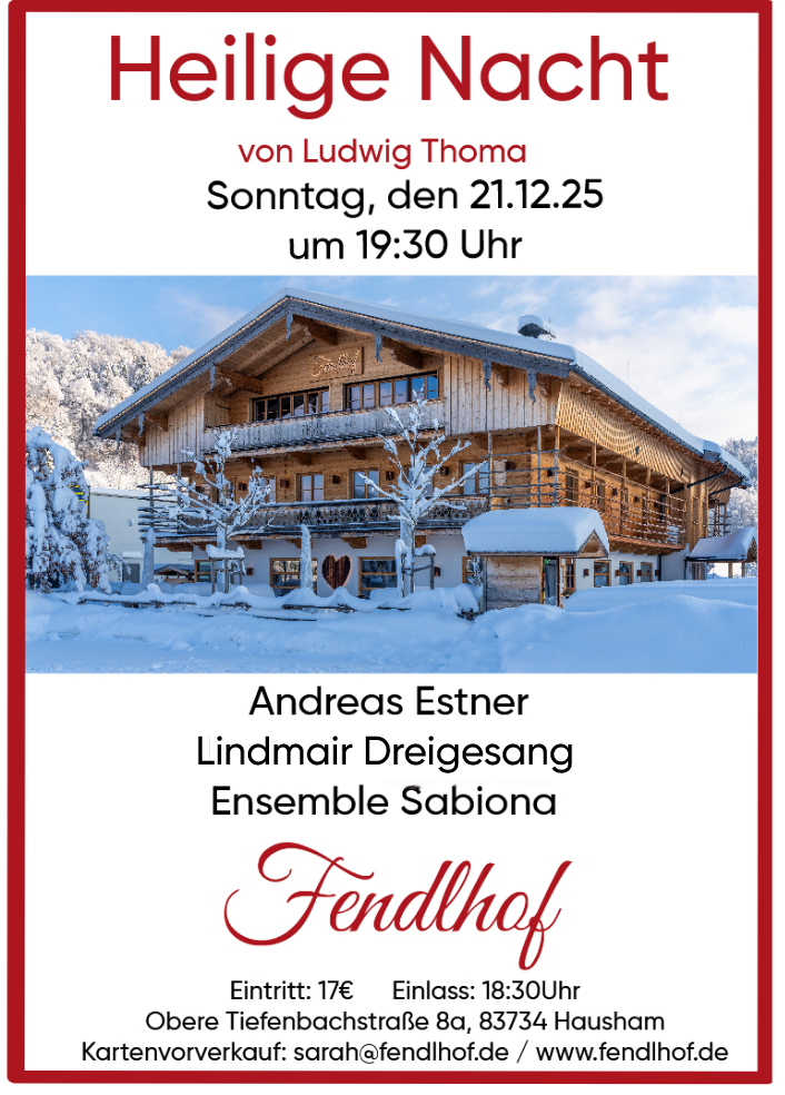Die einzigartige Weihnachtserzählung „Heilige Nacht“ von Ludwig Thoma hat seit mehr als 100 Jahren nichts von ihrer Ausstrahlung verloren. Bis heute zieht sie Erwachsene und Kinder in ihren Bann. Mit seiner Erzählung hat Ludwig Thoma 1916 den Zauber der Weihnachtsgeschichte im Dialekt des südlichen Oberbayern erzählt. Als Bühne für seine malerische Erzählung wählte er das winterliche Oberbayern, in dem Maria und Josef durch verschneite Wälder und raue Winterlandschaften ihren mühsamen Weg bestreiten, bis hin zur Herbergssuche in Bethlehem und den Hirten vor der Krippe. Andreas Estner aus Fischbachau, Sprecher und Autor beim Bayerischen Rundfunk, ist mit diesem Dialekt aufgewachsen und liest die Geschichte mit feinsinnigem Gespür heuer wieder am 21. Dezember um 19:30 Uhr im Fendlhof. Musikalisch umrahmt wird die Erzählung heuer vom Lindmair Dreigesang und den feinen Klängen vom Ensemble Sabiona bekannt vom Münchner Advent. Die Lesung findet im Dunkeln statt. Dadurch wirken Text und Musik besonders intensiv. Der Kartenvorverkauf is ab sofort. Der Eintritt kostet 17.- Euro.
