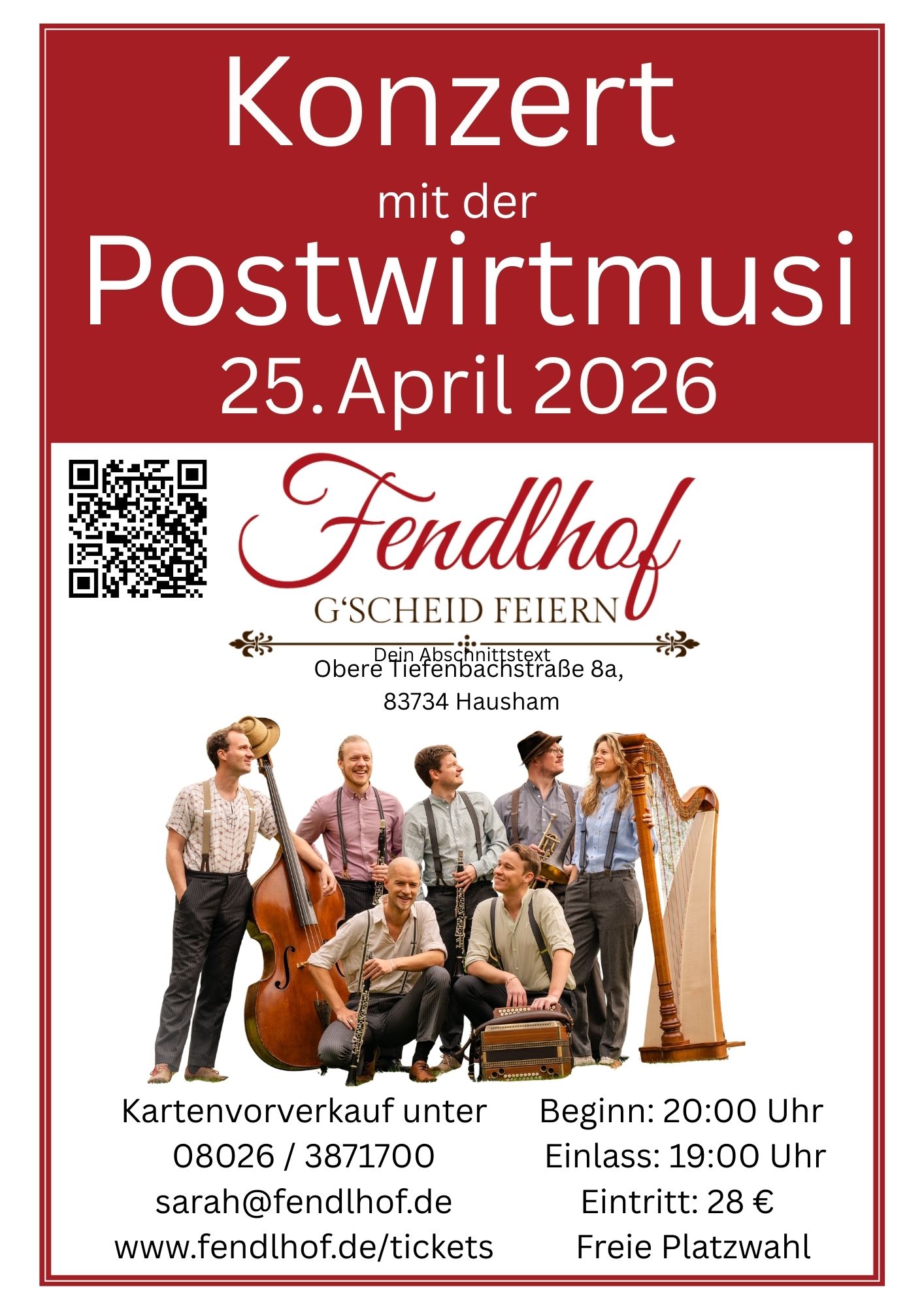 Am 25. April 2026 um 20:00 Uhr kommt die Postwirtmusi zu uns in den Fendlhof. Wenn die Musi spielt, gehen wir gern zum Wirt. Wenn die Wirtmusi spielt, geht die Post ab.