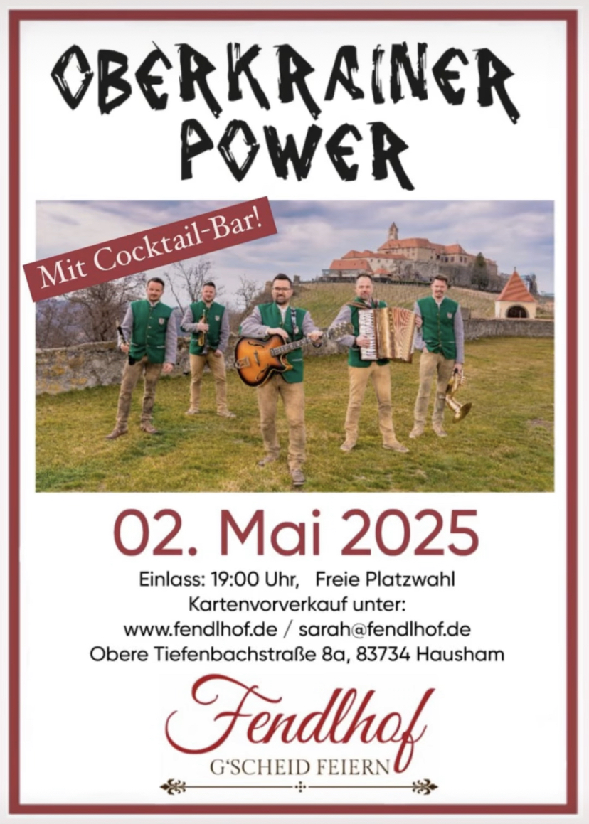 Am 2. Mai gibt es einen ganzen Abend ausschließlich mit Oberkrainer Klängen. Dazu sind die fünf Musikanten von Oberkrainer Power aus der Steiermark bei uns im Fendlhof zu Gast. Für diesen Abend haben wir auch eine Tanzfläche bereit, die man natürlich gerne benutzen darf.