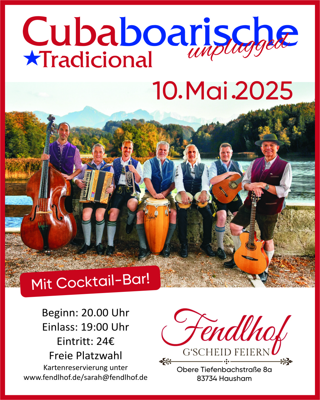 Außerdem findet am 10. Mai ein Konzert mit den Cubaboarischen Tradicional statt. Das Konzert der bereits langjährig bekannten Gruppe beginnt um 20:00 Uhr. Die Gruppe Cubaboarische Tradicional gründete sich nach der Auflösung der ehemaligen Gruppe „Die Cubaboarischen“, nachdem einige Musiker diese tolle und mitreißende Musik nicht aufgeben, sondern weiter machen wollten.