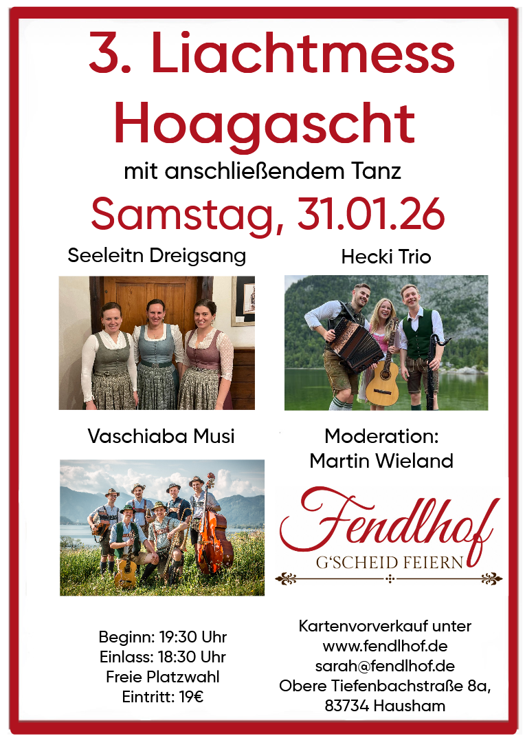 Am 31. Januar findet unser 3. Liachtmess Hoagascht statt. Dazu haben wir wieder außergewöhnliche Gruppen eingeladen, wie z. B. das Hecki Trio aus Österreich, den Seeleitn Dreigsang aus Oberbayern & die Vaschiaba Musi, ebenfalls aus Oberbayern. Durch den Abend führt Martin Wieland von BR-Heimat.