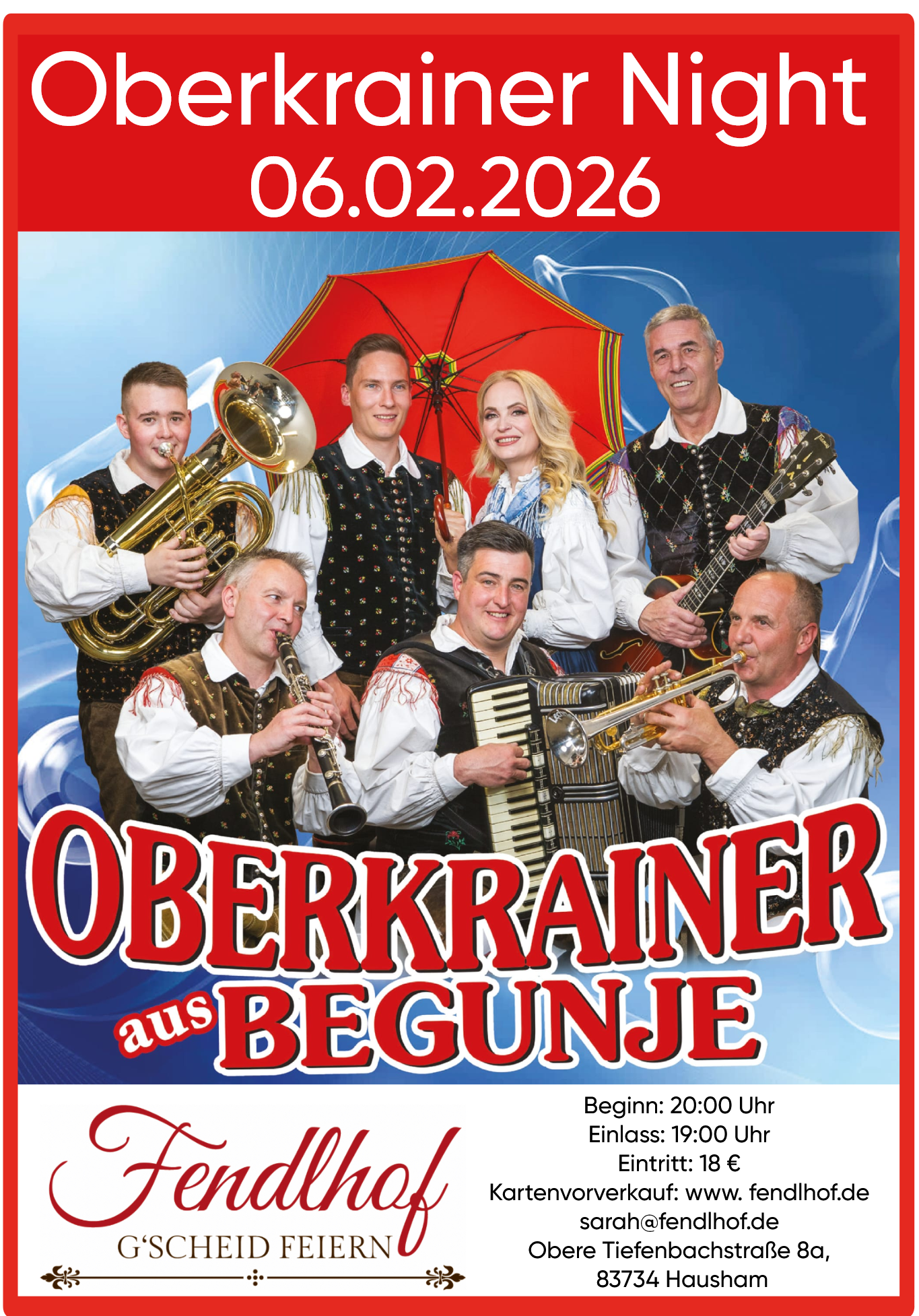 Am 06. Februar 2026 kommen die Oberkrainer aus Begunje zu uns in den Fendlhof. Mit einer ganzen Nacht, in der ursprüngliche, slowenische Oberkrainer Musik gespielt wird, freuen wir uns auf viele tanzbegeisterte Besucher.